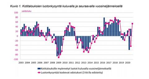 Finanssiala ry:n tuoreen Pankkibarometrin mukaan kotitalouksien luotonkysyntä on loppuvuoden aikana vilkastunut selvästi. Koronapandemian vaikutus näyttää jääneen vain tilapäiseksi pudotukseksi. Myös pankinjohtajien odotukset kotitalouksien lähikuukausien lainanottohalukkuudesta ovat hyvät. Sen sijaan yritysten luotonkysyntä on edelleen heikkoa. Loppuvuoden aikana luottoja on myönnetty selvästi vähemmän kuin viime vuonna samaan aikaan. Barometrikysely IV/2020 tehtiin pankinjohtajille marras-joulukuun vaihteessa.