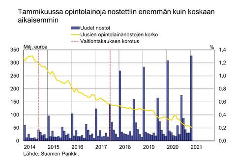 Opintolainoja nostettiin tammikuussa enemmän kuin koskaan aikaisemmin