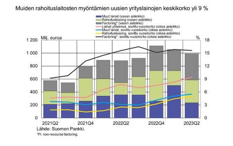 Muiden rahoituslaitosten myöntämien uusien yrityslainojen keskikorko yli yhdeksän prosenttia
