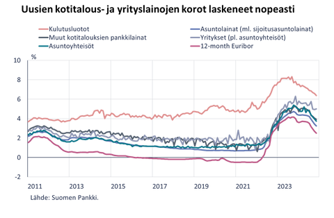 Uusien kotitalous- ja yrityslainojen korot laskeneet nopeasti
