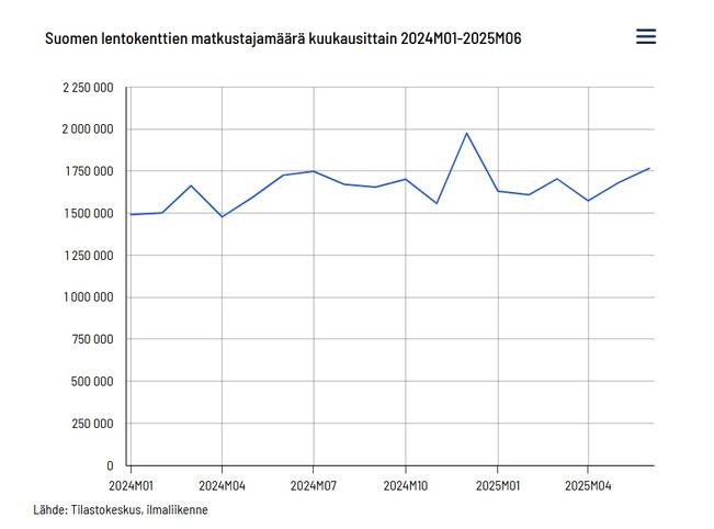 Tilastokeskuksen mukaan Suomen lentokenttien kautta lensi yhteensä 1,7 miljoonaa matkustajaa kesäkuussa. Kokonaismatkustajamäärä kasvoi yhdeksän prosenttia vuoden 2023 kesäkuuhun verrattuna. Kotimaanlentojen matkustajamäärä laski prosentin, kun taas ulkomaanlentojen matkustajamäärä kasvoi kymmenen prosenttia edellisvuodesta.