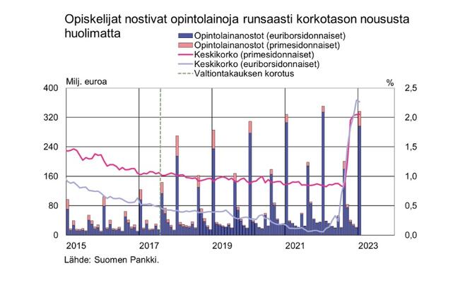 Opiskelijat nostivat opintolainoja aiempaa vähemmän korkojen noustua