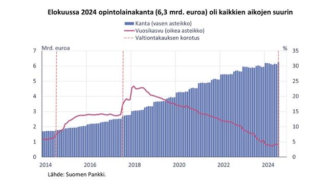 Opintovelallisten määrän kasvu hidastui viime vuonna