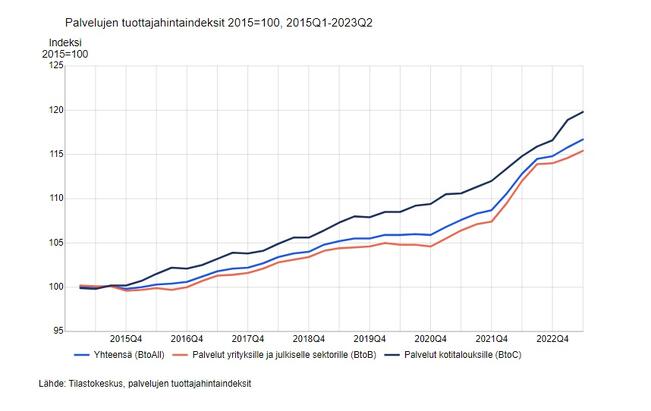 Palvelujen tuottajahinnat nousivat 3,4 prosenttia vuoden takaisesta huhti–kesäkuussa