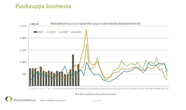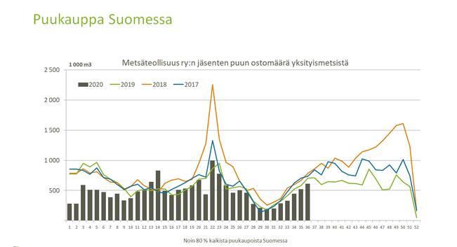 Metsäteollisuus ry:n jäsenet ostivat tammi–lokakuussa puuta yksityismetsistä 32,3 miljoonaa kuutiota. Määrä on 16 prosenttia enemmän kuin edellisen vuoden vastaavana aikana. Viiden vuoden vastaavan ajan keskiarvoon verrattuna määrä on 20 prosenttia suurempi.