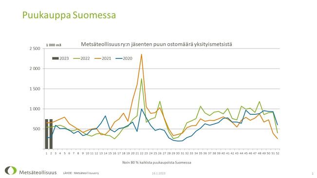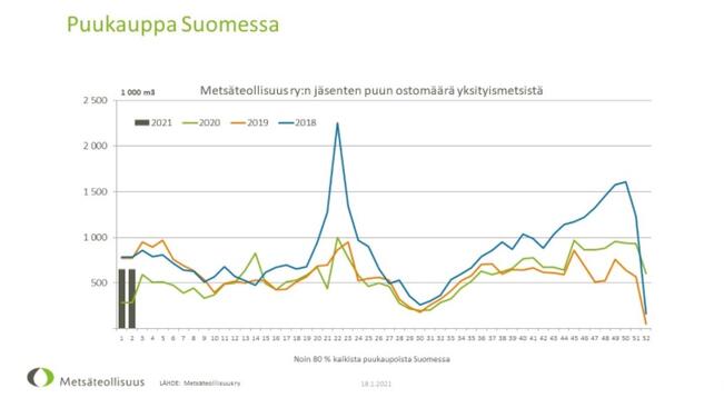 Metsäteollisuus ry:n jäsenyritykset ostivat tammi–helmikuussa puuta yksityismetsistä 5,5 miljoonaa kuutiota. Määrä on noin kolmanneksen edellisvuoden alkua enemmän, ja neljä prosenttia enemmän kuin viiden vuoden keskiarvo.