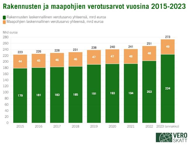 Verohallinnon ennakkotietojen perusteella kiinteistöveroja kerätään tänä vuonna kunnille 2,4 miljardia euroa. Kiinteistöveron tuotto nousee noin 171 miljoonaa (+7,7 %) suuremmaksi kuin viime vuonna. Maapohjista kertyvä kiinteistövero kasvaa 20,9 prosenttia (115 miljoonaa euroa) ja rakennuksista kertyvä vero 3,4 prosenttia (57 miljoonaa euroa).