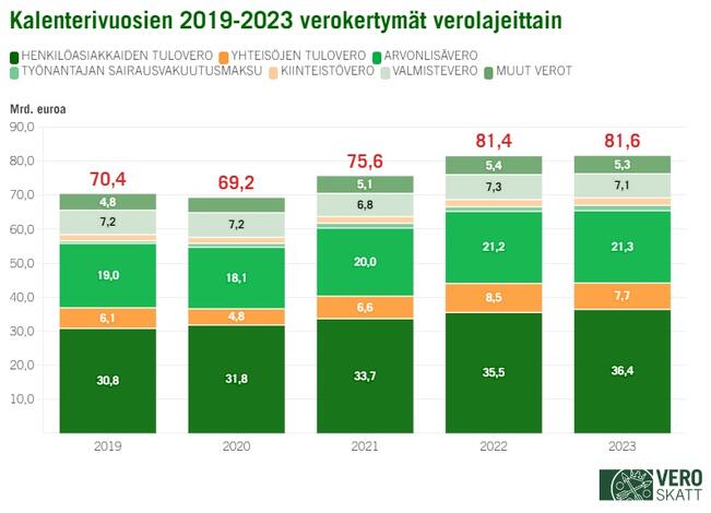 Verohallinto keräsi tammi–maaliskuussa veroja 22 392 miljoonaa euroa. Verohallinnon kertymissä ei ole huomioitu muiden viranomaisten keräämiä veroja, joista euromäärältään merkittävin on Traficomin keräämä ajoneuvovero.