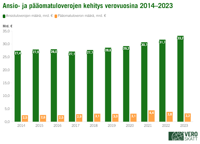 Pääomatuloverojen määrä laski, yhteisöveroa maksettiin vähemmän kuin vuotta aikaisemmin