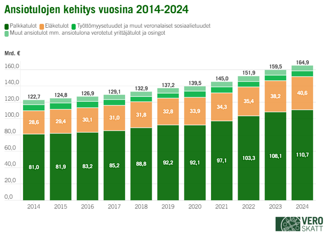 Ansiotulot kasvoivat, mutta työllisyyden heikkeneminen hidasti palkkojen verotulojen kasvua
