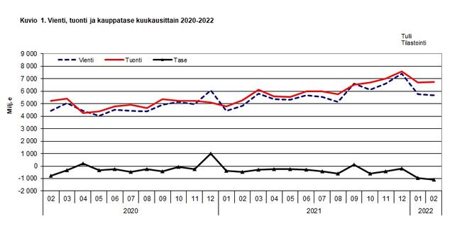 Tavaraviennin arvo nousi 17,5 prosenttia helmikuussa