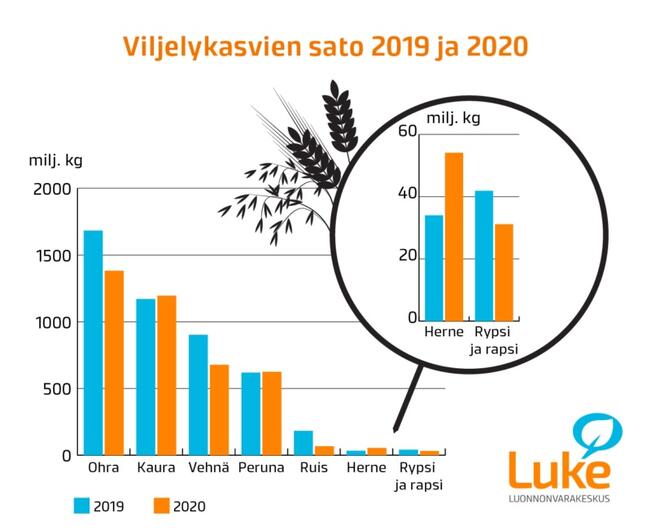 Vuoden 2020 viljasadon pääviljan, ohran, sato jäi viidenneksen keskimääräisestä. Samoin kävi vehnä- ja ruissadoille. Sen sijaan kaurasato ylittää kymmenen vuoden keskisadon kymmenyksellä.
