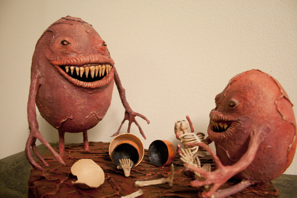 – Kun olin lapsi, ihastuin Hugo Simbergin töihin, joita äitini ripusti ympäri kämppää. Ne olivat pelottavia, mutta samalla jotenkin kilttejä ja helposti lähestyttäviä. Haluan itsekin esittää hirviöt hauskoina ja sympaattisina tyyppeinä, ei pelkästään kauhuolentoina, Koivistoinen kertoo. Koivistoinen ja Tuomisalo ovat aikaisemmin tehneet muun muassa erilaisia koristeita helsinkiläiselle Night Visions -kauhuelokuvafestivaalille. Hiljalleen erinäiset vapaa-ajalla työstetyt otukset ovat jalostuneet kirjahyllyjen päältä myös muiden nähtäviksi. – Ideat tulevat kaikesta oudosta, oli se sitten lähtöisin sarjakuvista, elokuvista tai kirjallisuudesta. Mielestäni tietynlainen synkkyys on paljon kauniimpaa kuvastoa kuin normaalit, jokapäiväiset asiat, Tuomisalo tuumaa. – Hirviöt ja yliluonnolliset hahmot kiinnostavat ihmisiä kovasti, ja ne esitetään usein pelkoa aiheuttavina. Meidän näyttelyssämme ne ovat aika pieniä ja söpöjäkin, Koivistoinen sanoo. Sekä Koivistoisella että Tuomisalolla on taustallaan animaatio-opinnot, mikä myös näkyy erityisesti veistoksen muotoon tehdyissä, osittain nukkemaisissa monstereissa. Yksi teoksista on eräänlainen Cthulhu-mytologiaa mukaileva peili, kun taas toinen on hirviömäiseen muotoon taiteiltu kalastusvälinekaappi. – Mietin mitä tekisin sille kalastusvälinekaapille, ja lopulta löysin Kalastustaikoja-nimisen kirjan. Kalastukseen on ennen liitetty yllättävän paljon magiaa ja uskomuksia. On heitetty hopeaa veteen ja merkattu reittejä. Se on juuri sellaista outoutta, jota tykkään tuoda taiteeseen, Tuomisalo sanoo. Osa näyttelyn teoksista on saanut vaikutteita myös vanhan ajan uskomuksista, salatieteistä ja okkultismista. Niin Koivistoinen kuin Tuomisalo kuitenkin vakuuttavat, että teosten pentagrammeja ei tarvitse suotta kauhistella. – Ihminen itse antaa esineille haluamansa merkityksen. Miksi esimerkiksi vuohen pää itsessään liittyisi yhtään mihinkään, Tuomisalo toteaa. Demonomania! esillä Martin Kulttuuriolohuoneessa 30.11. asti