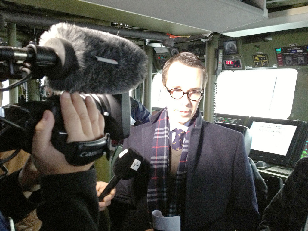 Puolustusministeri Carl Haglund (r.) vieraili maanantaina Turussa Saaristomeren meripuolustusalueella Pansion laivastoasemalla. Haglund hyppäsi Aurajoen varrelta Hämeenmaa-luokan miinalaiva Uudellemaalle ja seurasi matkalla Pansioon harjoitusta, jossa alustarkastusosasto nousi laivaan.