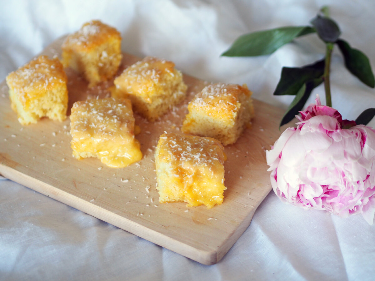 Valmista päällinen. Sulata voi, sokeri ja vanilliinisokeri kattilassa vispaten. Lisää keltuaiset ja vispaa kovempaa, kunnes seos on tasainen. Älä nosta lämpöä liian korkealle. Kun kakku on viilennyt kaada kuorrute kakun päälle ja koristele lopuksi kookoshiutaleilla. Kuorrute saa olla lämmintäkin, kakusta tulee ainoastaan mehevämpi kun kuorrute imeytyy hieman kakkuun.