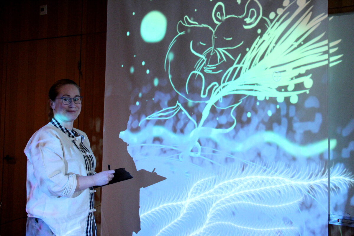 – Sekin on ollut haastavaa, kun piirtää mustalle piirtolevylle ja kädenjäljen näkee vain seinälle heijastettuna.