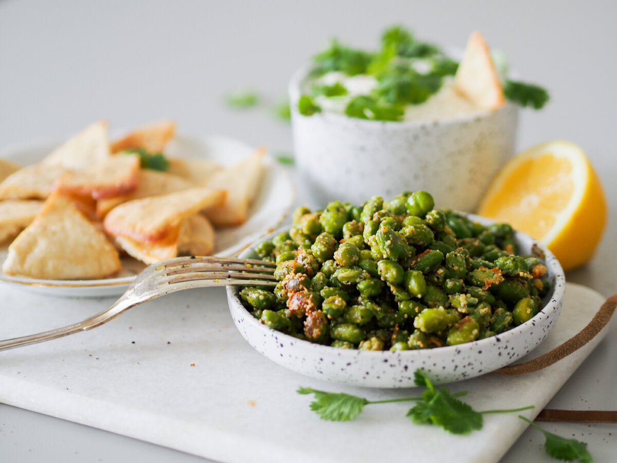 Terveellistä napostelua, eli paahdettuja edamameja ja rapeita pitapaloja raikkaalla dipillä