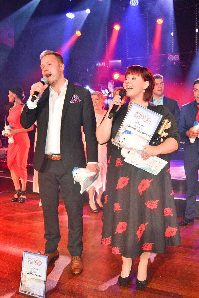Risteilymatkustajat kannustivat äänekkäästi suosikkejaan. MeriTangon yleisöäänestyksen voittivat Hanna Hirvonen ja Jarno Kokko.