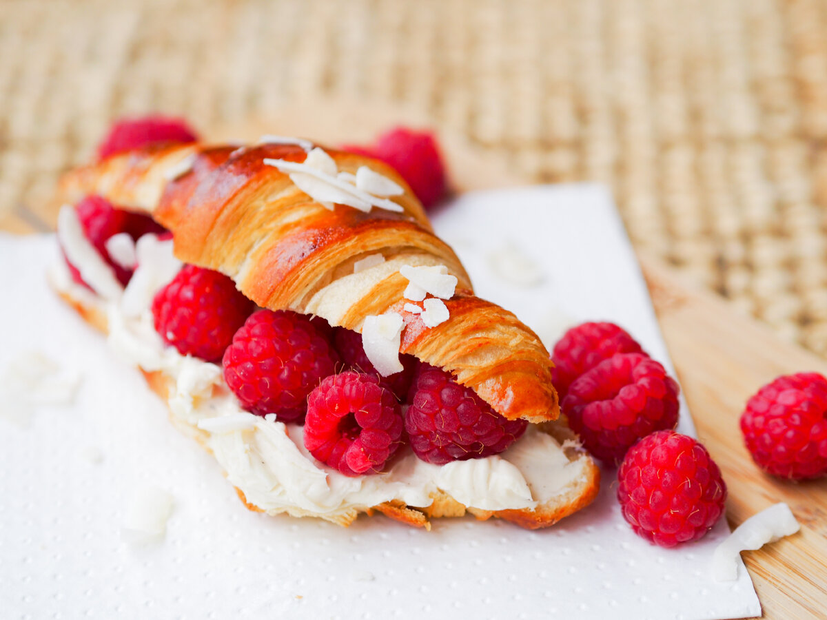 Leikkaa croissantit halki ja täytä vaniljatuorejuustolla, tuoreilla vadelmilla ja lisää mukaan vielä muutama tuore mintunlehti.