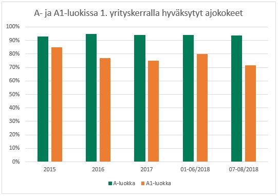 Moottoripyörien uudet käsittelykokeet otettiin käyttöön ajokauden alussa huhtikuussa. Uusitun moottoripyörän käsittelykokeen on suorittanut noin 8 500. Huhti–elokuussa moottoripyörän käsittelykokeen ensimmäisellä yrityskerralla hyväksytysti suoritti 82 prosenttia, kun vuonna 2017 ensimmäisellä kerralla läpi pääsi 90 prosenttia.
