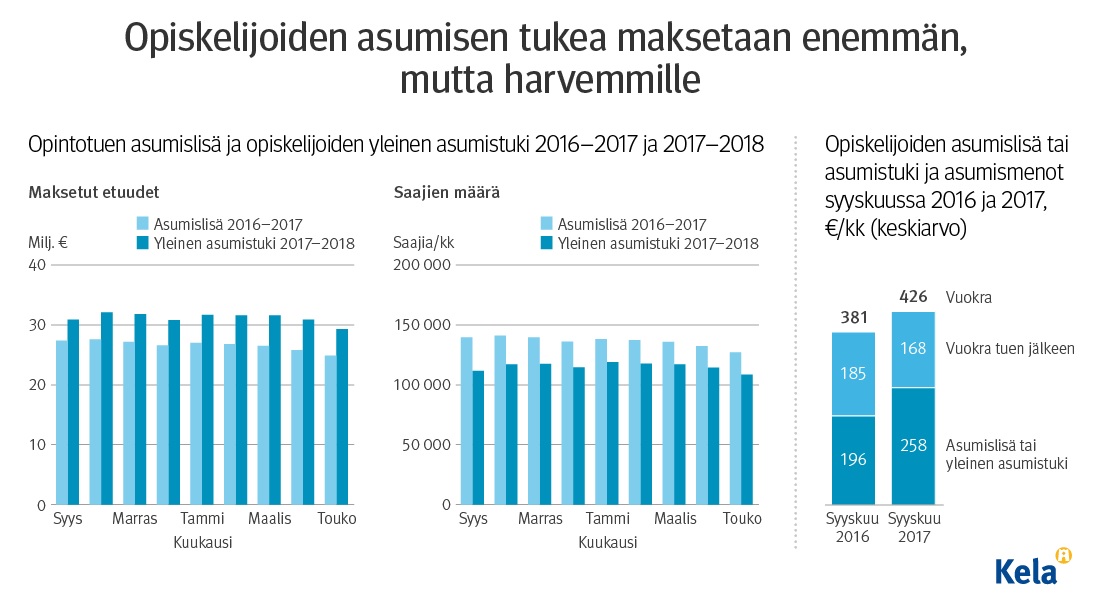 Tiedot perustuvat Kelan rekistereihin opintotuen asumislisästä ja yleisestä asumistuesta. Tarkastelu kattaa lukuvuodet 2016–17 ja 2017–18.