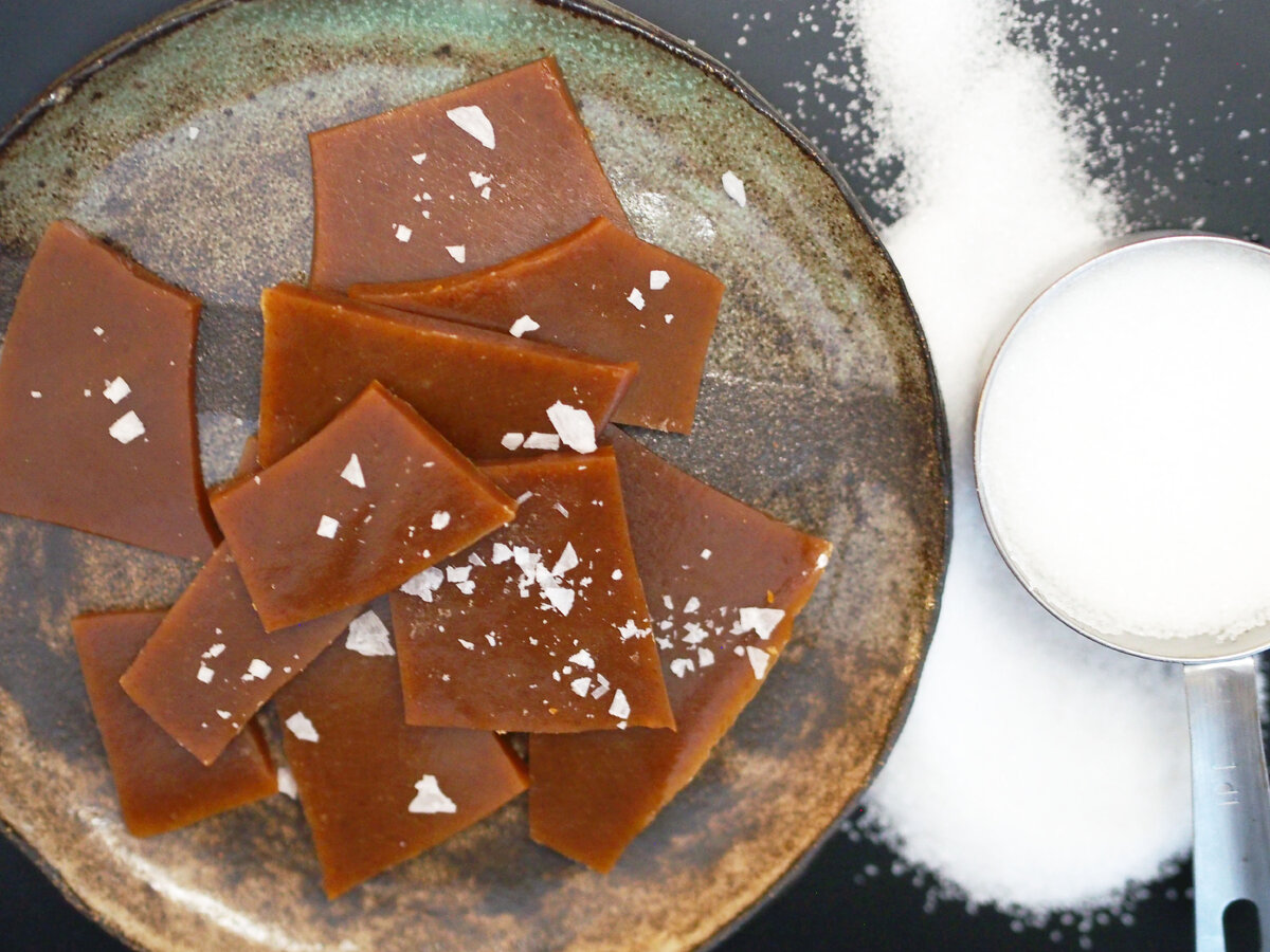 Sulata voi paksupohjaisessa kattilassa ja lisää loput ainekset joukkoon. Keittele hämmentäen (noin 20 minuuttia) kunnes seos on ruskeaa ja tönkömpää, ja irtoaa kattilan reunoista hämmentäessä. Kaada massa leivinpaperille, jäähdytä ja leikkaa.