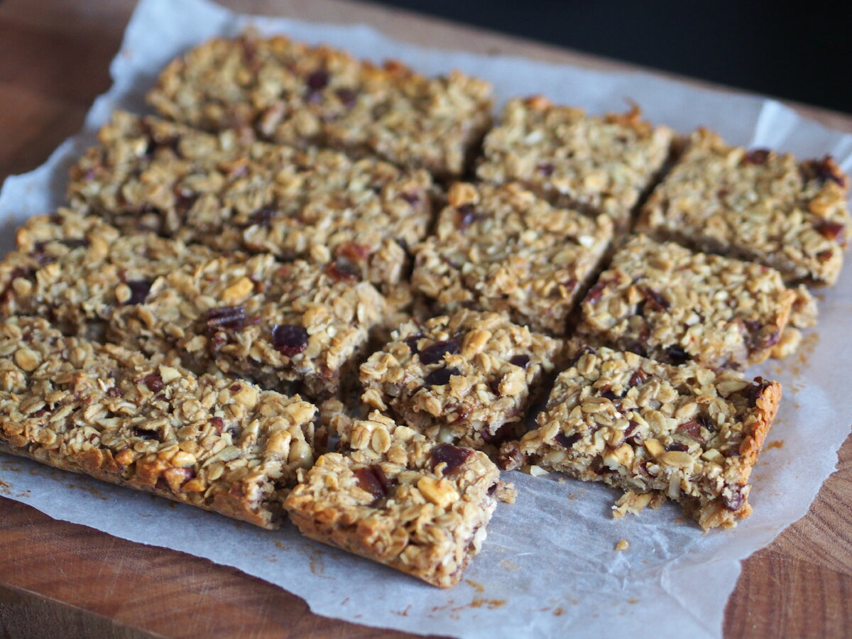 Lämmitä uuni 180 asteeseen. Rouhi pähkinät ja pilko taatelit pieniksi paloiksi. Lisää astiaan kaurahiutaleet, rouhitut pähkinät ja pilkotut taatelit. Laita voi, hunaja ja omenamehu pieneen kattilaan, sekoita ja kiehauta. Ota kattila pois levyltä. Lisää joukkoon maapähkinävoi ja sekoita tasaiseksi. Lisää seos kuiviin aineksiin ja sekoita.