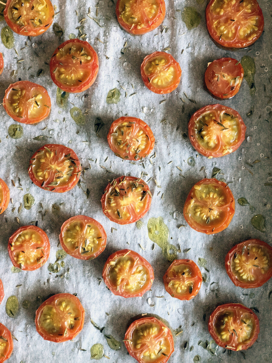Aamulla uunissa odottavat ihanan herkulliset tomaatit, joita voi laittaa vaikkapa leivän päälle tai napostella sellaisenaan munakkaan kaverina.