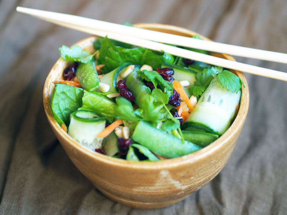 Yhdistä kastikeainekset purkkiin ja ravista. Pilko salaatti, sokeriherneet ja korianteri pieneksi. Kuori ja raasta porkkanat raastimen isommalla terällä. Kuori ja pilko kurkku pieniksi paloiksi, tai leikkaa juustohöylällä pitkulaisia kurkunpaloja. Yhdistä ainekset keskenään ja kaada kastike joukkoon. Sekoita salaatti ja tarjoile heti. Jos tarjoilet salaatin myöhemmin, sekoita kastike joukkoon vasta juuri ennen tarjoilua.