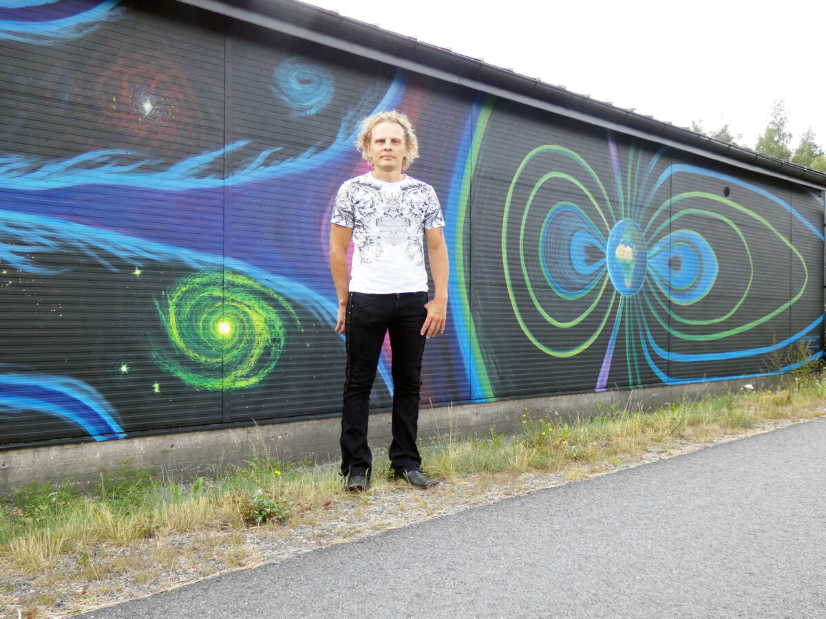 – Ensin käyn kuvaamassa kohteen, tutustun siihen paikkaan. Tämän jälkeen alan miettiä kohteeseen sopivaa ideaa. Idean saatuani alan työstämään piirrosta siitä. Härkämäen teoksessa opiskelin muun muassa avaruutta ja galakseja, miten aurinkotuuli toimii tieteellisesti. Muunsin sen kuvaksi.