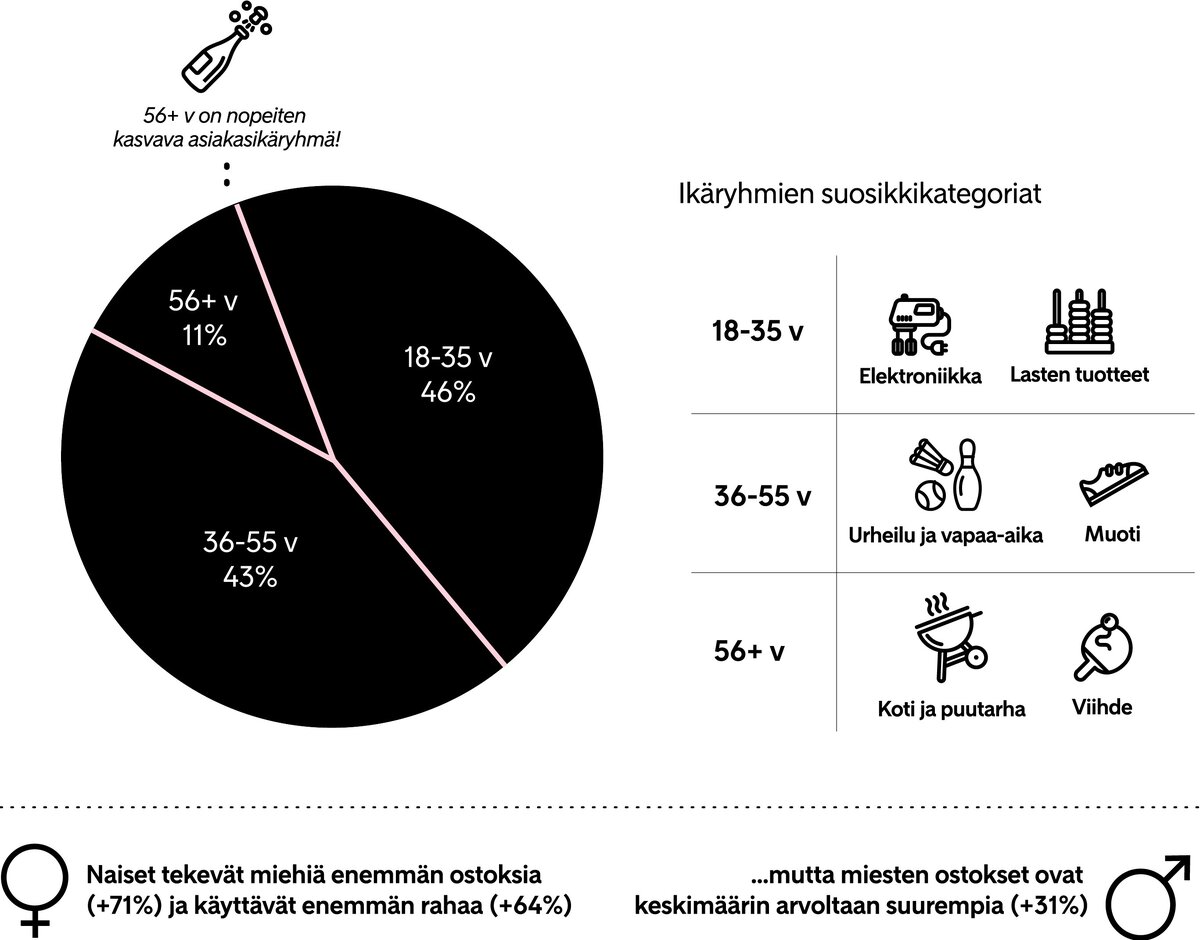 Miesten kertaostosten arvo on kuitenkin 31 prosenttia suurempi. Eniten rahaa verkkokauppaan käyttävät 18–35- vuotiaat (45 prosenttia kokonaismäärästä). Yli 56-vuotiaat taas käyttävät vähemmän rahaa verkkokauppaan, mutta ovat toisaalta nopeimmin kasvava verkkokaupan asiakasryhmä.