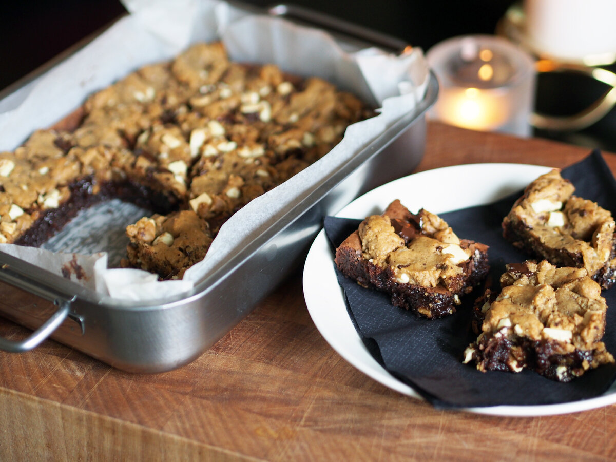 Talvella suklainen ja mehevä browniepohja saa esipaiston jälkeen päälleen valko- ja tummasuklaarouheella maustettua piparkakkutaikinaa. Itse tehty piparkakkutaikina on tietysti aina parempaa, mutta pakastetaikinalla voi oikaista hieman, ja lopputulos on yhtä herkullinen.