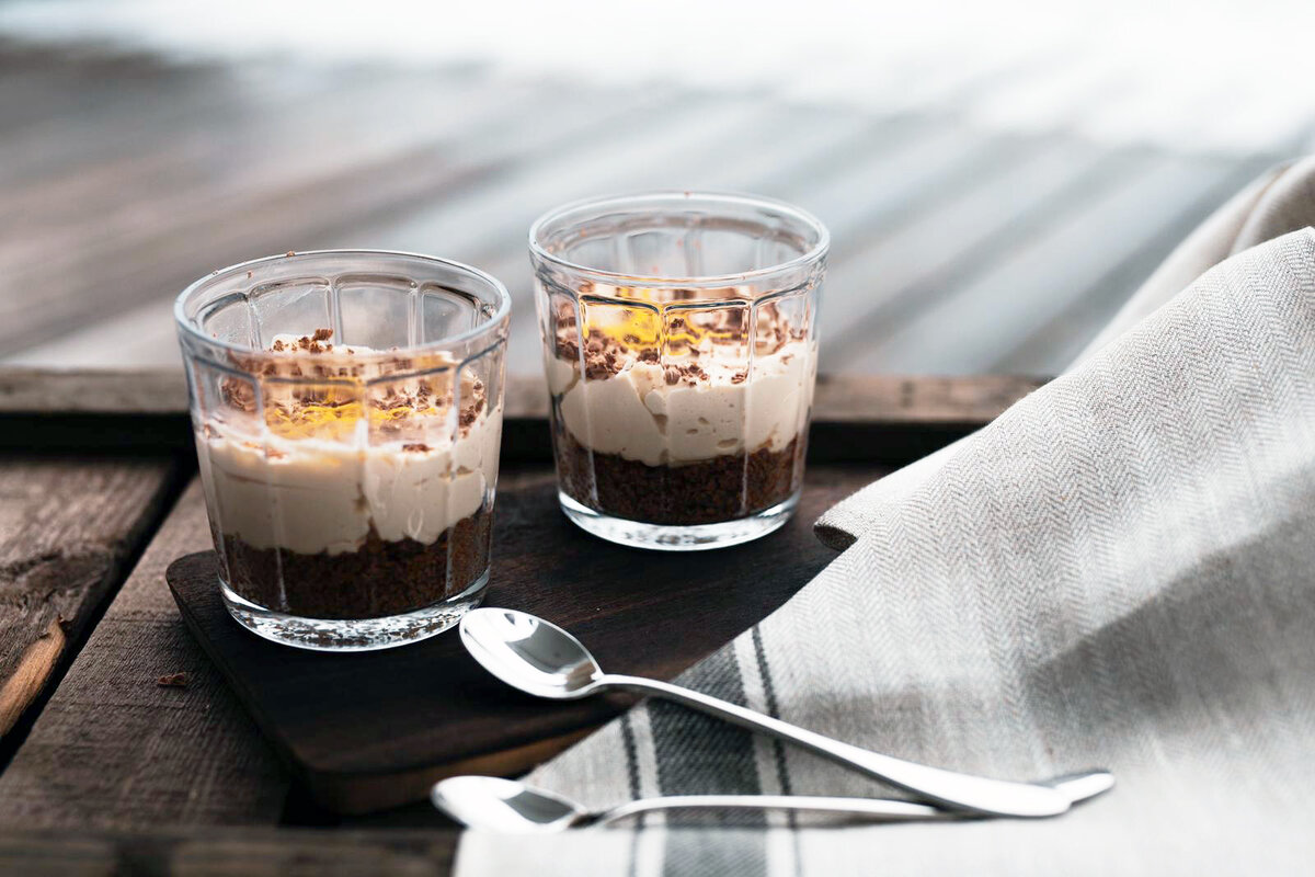 Lusikoi täyte laseihin piparkakkupohjan päälle ja anna jähmettyä jääkaapissa vähintään neljä tuntia. Koristele esimerkiksi piparimurskalla ja tarjoile.