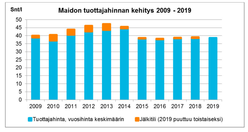 Vuonna 2019 meijerit maksoivat tuottajille keskimäärin 38,61 senttiä maitolitralta eli suunnilleen saman verran kuin edellisvuonna. Maidon keskimääräinen tuottajahinta on pysynyt lähes samana viimeisen kolmen vuoden ajan.