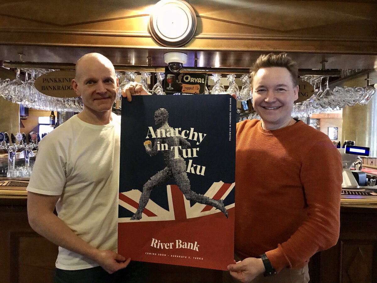 – Meille tärkeä kriteeri oli se, että nimen pitäisi olla helposti lausuttavissa – myös muutaman tuopillisen jälkeen. Heti kun näimme River Bank -nimen, tuli fiilis, että tässä se on! Tässä nimessä on aitoa brittipubin henkeä, ja se voi olla asiakkaiden suussa River Bank tai Riveri, ja se sopii hienolla tavalla Turkuun, koska Aurajoen tuntumassahan tässä ollaan, hehkuttaa Kiili.