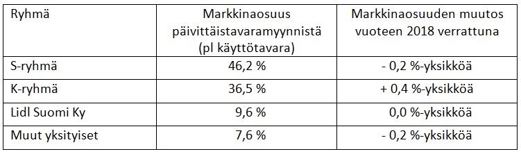 K-ryhmän markkinaosuus päivittäistavaramyynnistä nousi 36,5 prosenttiin vuonna 2019. Kokoluokaltaan suurimmat myymälät, K-Citymarketit ja K-Supermarketit, kasvattivat myyntiään selvästi päivittäistavaramarkkinan keskimääräistä kehitystä voimakkaammin. K-Citymarketin myynnin kasvu oli 5,1 prosenttia, minkä myötä sen markkinaosuus kasvoi eniten kaikista ketjuista ja nousi 12,1 prosenttiin. K-Supermarket -ketjun myynnin kehitys oli 4,1 prosenttia ja sen markkinaosuus nousi 12,5 prosenttiin.