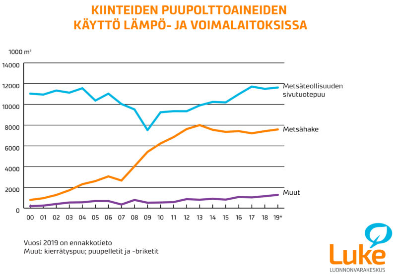 Kiinteiden puupolttoaineiden lämpö- ja voimalaitoskäyttö jatkoi vuonna 2019 hidasta kasvuaan neljättä vuotta peräkkäin. Sekä metsähakkeen että metsäteollisuuden sivutuotepuun kulutus lisääntyi. Kokonaiskäyttö päätyi ennätykselliseen 20,5 miljoonaan kiintokuutiometriin.