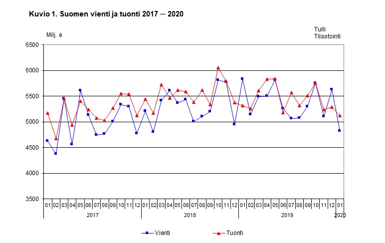 Kauppatase oli tammikuussa 300 miljoonaa euroa alijäämäinen. Viime vuoden tammikuussa kauppatase oli 516 miljoonaa euroa ylijäämäinen. Yksikköarvoindeksin mukaan laskettu ulkomaankaupan vaihtosuhde] heikkeni tammikuussa vuoden 2019 vastaavaan kuukauteen verrattuna, koska tuontihinnat nousivat ja vientihinnat laskivat. Pisteluku oli tammikuussa 96,8 ja edellisvuonna 100,3. Vaihtosuhde heikkeni vuoden 2019 joulukuusta, jolloin pisteluku oli 98,6.