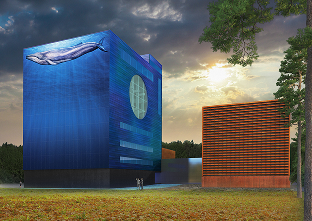 – Big Blue on taiteellis-arkkitehtoninen matka meren syvyyksiin. Se nostaa 60 metrin korkeuteen meren pinnasta, suurimman koskaan planeetallamme eläneen eläimen ja haastaa pohtimaan luonnon, ihmisen ja rakennetun ympäristön suhdetta, kuvataiteilija Mauri Kosonen kertoo.