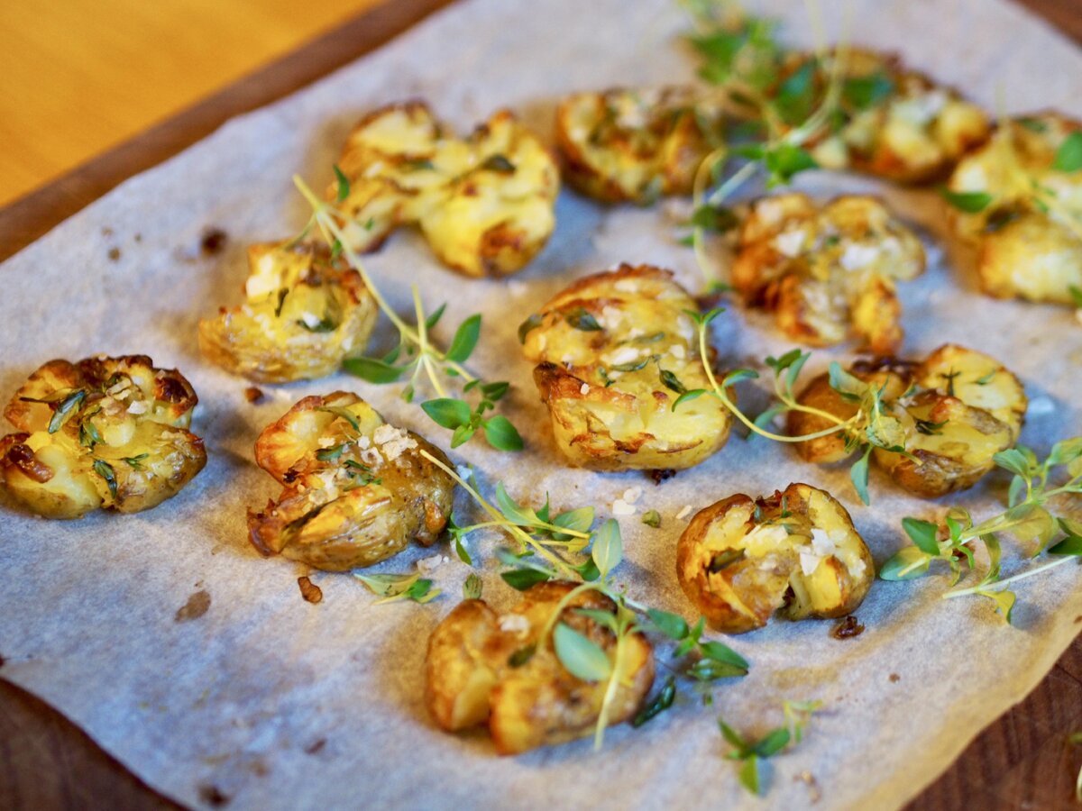 Paina perunat lyttyyn paistinlastalla niin, etteivät ne hajoa kokonaan. Sudi perunoiden päälle valkosipulivoita ja silppua tuoreita yrttejä. Laita päälle vielä sormisuolaa. Paahda uunissa noin 20 minuuttia, tai kunnes perunat ovat kullanruskeita.
