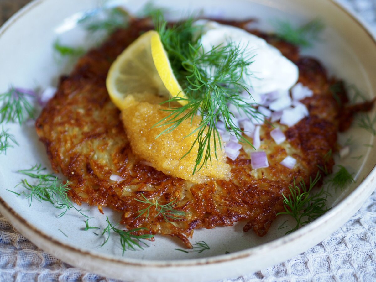Ne voi tarjoilla yksinkertaisilla täytteillä, joita löytyy jääkaapista, tai niin kuin tässä reseptissä, astetta elegantimpana versiona. Mäti, pilkottu punasipuli, kermaviili, tuore tilli ja sitruuna vievät kielen mennessään rapean perunapaistoksen päällä. Tärkeintä on puristaa perunaraasteesta huolellisesti ylimääräinen neste pois, jotta paistoksesta tulee oikein rapea ja kullanruskea.