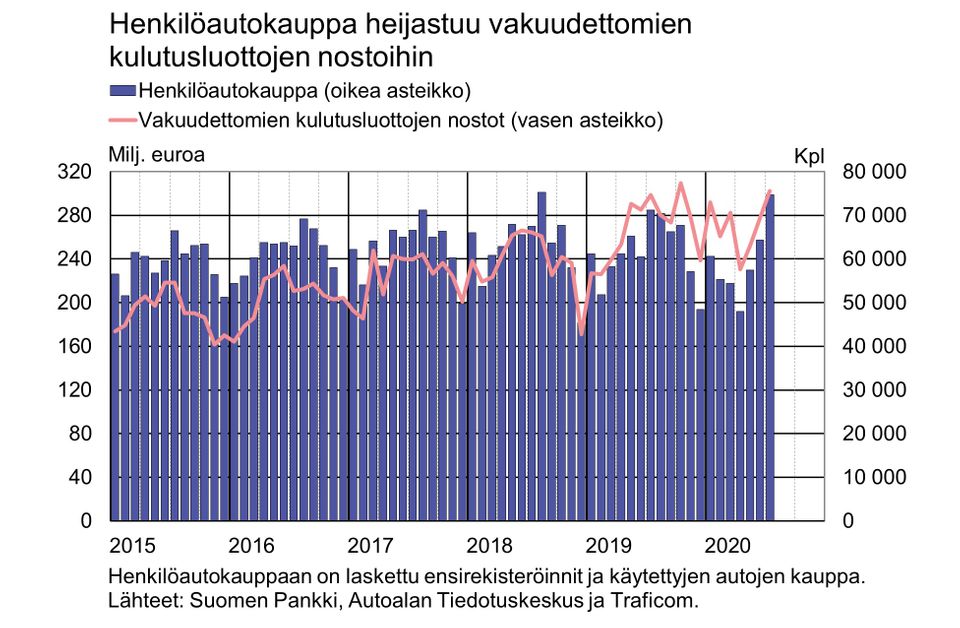 Vakuudettomien kulutusluottojen nostomäärät pienenivät poikkeusolojen aikana, mutta palautuminen on ollut nopeaa. Kuluttajien luottamus ja halukkuus kestohyödykkeiden ostoon heijastuvat osin vakuudettomien kulutusluottojen kysyntään. Henkilöautokaupan kehitys vaikuttaa selittävän osan nostomäärien vaihteluista, mutta vakuudettomien kulutusluottojen nostoissa on lisäksi nähtävissä pidemmän aikavälin nouseva trendi.
