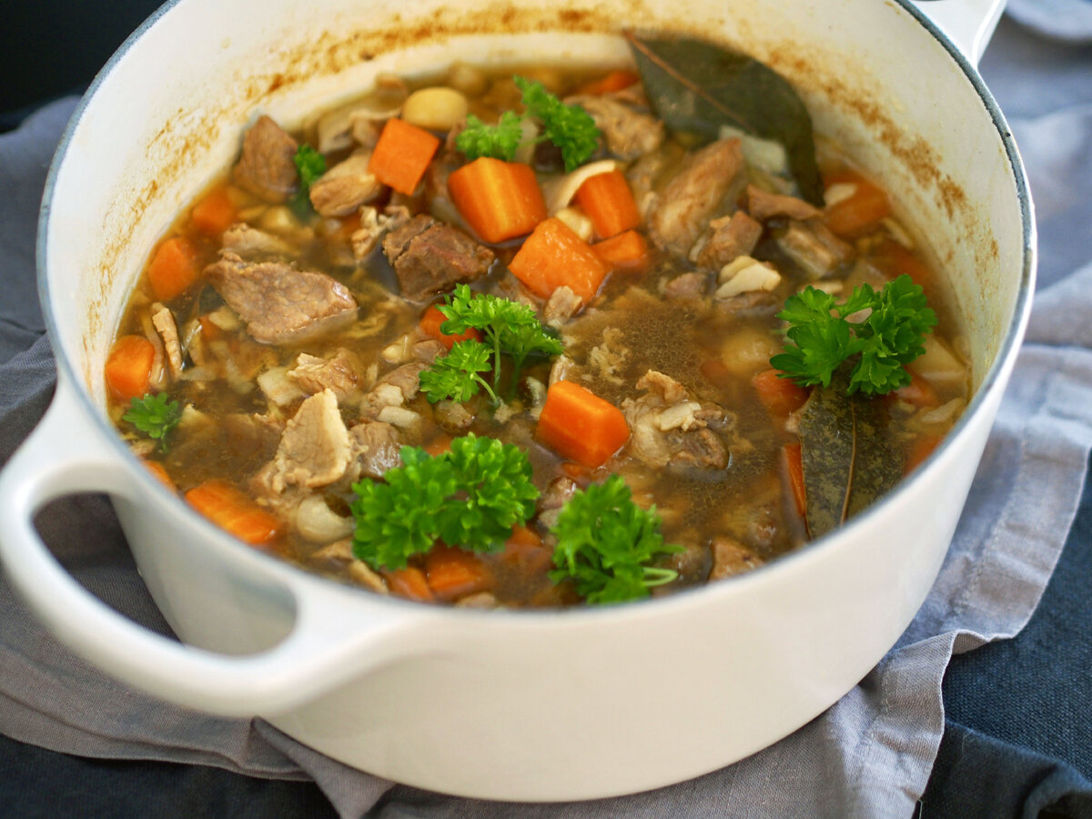 Ota liha huoneenlämpöön noin puoli tuntia ennen kypsennystä. Leikkaa liha kolmen senttimetrin kuutioiksi. Sulata voi ja öljy padassa tai kattilassa. Lisää lihakuutiot ja paista väri kauttaaltaan. Lisää naudanlihafondi ja vesi. Kiehauta ja kuori ylimääräinen vaahto pinnalta. Anna porista miedolla lämmölllä puolisen tuntia. Pilko sillä aikaa sipuli, porkkanat, juuriselleri ja palsternakka.