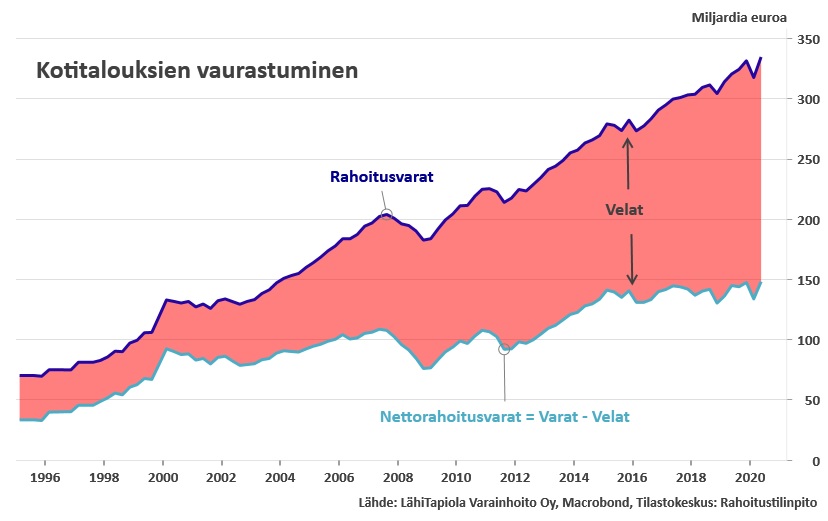 Tilastokeskus kertoi, että suomalaiskotitaloudet ovat vaurastuneet yhä enemmän koronakeväänä. Vuoden toisella neljänneksellä suomalaisten kotitalouksien rahoitusvarat kasvoivat 17,0 miljardia euroa kohoten 334,7 miljardiin euroon. Kotitalouksien velat puolestaan lisääntyivät 2,6 miljardia nousten 186,5 miljardiin euroon. Näiden muutosten seurauksena kotitalouksien nettorahoitusvarat kasvoivat 14,4 miljardilla eurolla ja nettorahoitusvaroja oli 148,2 miljardia euroa.