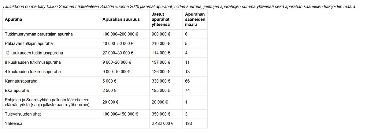 Syöpäsairaudet on suurin yksittäinen tautiryhmä, jonka tutkimukseen Suomen Lääketieteen Säätiö myönsi apurahoja vuonna 2020. Syöpätutkijat saivat yhteensä 30 apurahaa eli 17 prosenttia kaikista apurahoista. Seuraavaksi eniten apurahoja jaettiin lastentautien (15 %), sydän- ja verisuonitautien (13 %) ja neurologisten tautien (12 %) tutkimukseen.