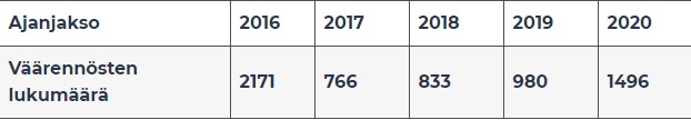 Suomessa setelikierrosta löydettiin vuoden 2020 aikana 1 496 euroseteliväärennöstä. Määrä on kasvanut viime vuodesta, mutta on edelleen muuhun euroalueeseen verrattuna vähäinen.