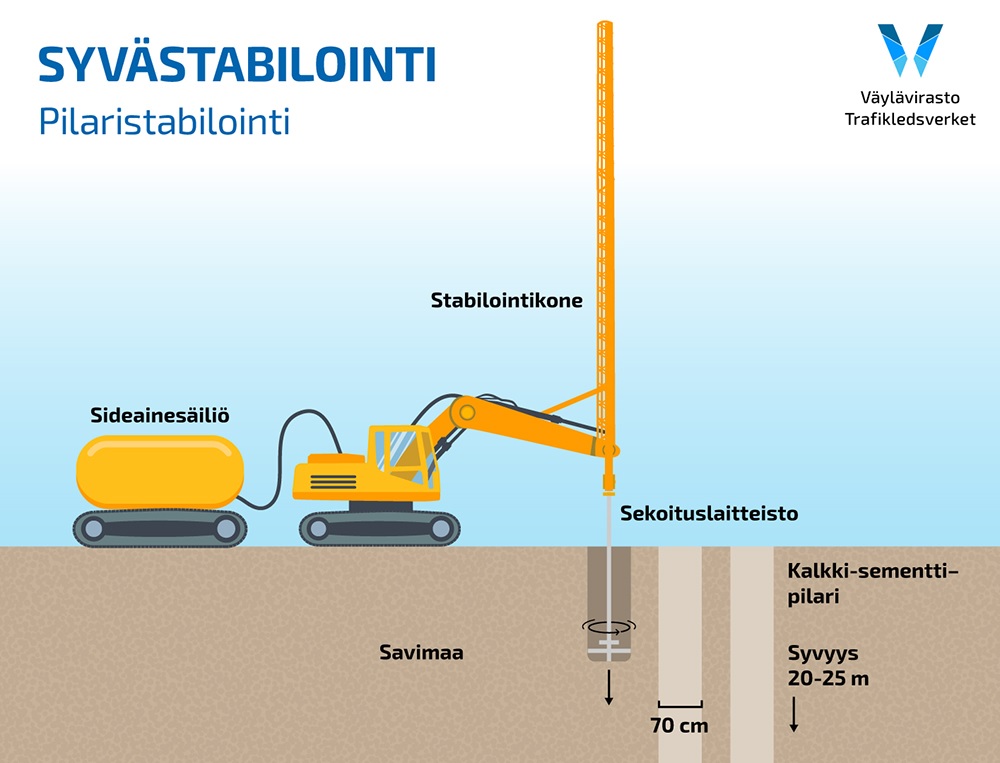 Syvästabilointi tapahtuu käytännössä niin, että halkaisijaltaan 70-senttinen vispilä työnnetään saveen määrättyyn syvyyteen. Vispilää pyöritetään ja nostetaan ylöspäin samalla kun sen kautta maahan sekoitetaan sideainetta, joka lujittaa saven kantavaksi pilariksi. Pilareista muodostetaan lamelleja, jotka toimivat kantavan rakenteena ja samalla lujittavat savea sortumia vartaan.