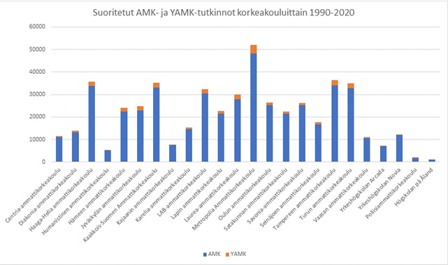 Vuonna 2020 suoritettiin 24 370 AMK-tutkintoa. Suoritettujen tutkintojen määrä oli kolmatta vuotta samalla tasolla. Sen sijaan YAMK-tutkinnoissa oli kasvua, kun niitä valmistui vajaa 3 900. Kasvua edellisestä vuodesta oli 16 prosenttia.