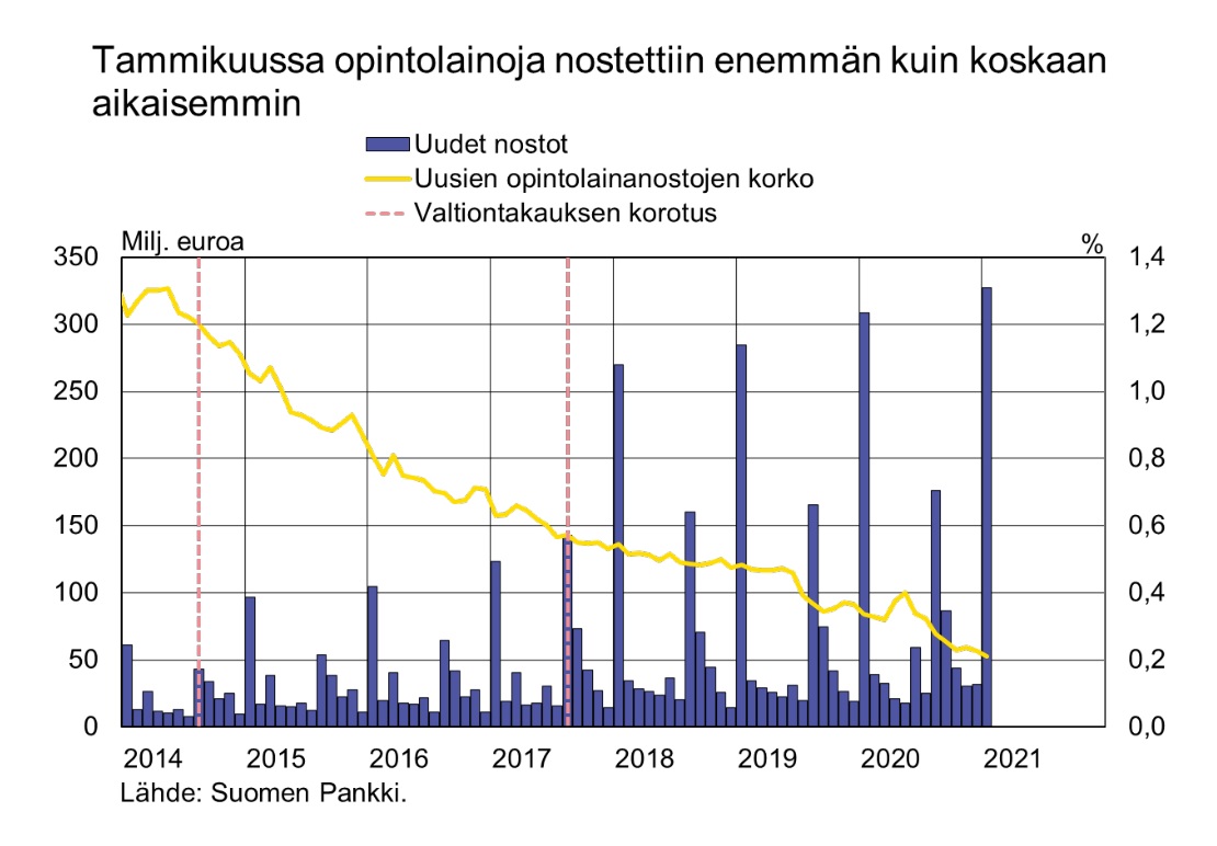 Opintolainoja nostettiin tammikuussa 327 miljoonan euron edestä, mikä on kuusi prosenttia enemmän kuin vuosi sitten vastaavana aikana ja enemmän kuin koskaan aikaisemmin kuukauden aikana. Tammikuussa nostettujen opintolainojen keskikorko oli ennätyksellisen alhainen (0,21 %). Euriborsidonnaisten lainojen osuus oli 93 prosenttia kaikista nostetuista opintolainoista, ja niiden keskikorko oli 0,16 prosenttia.