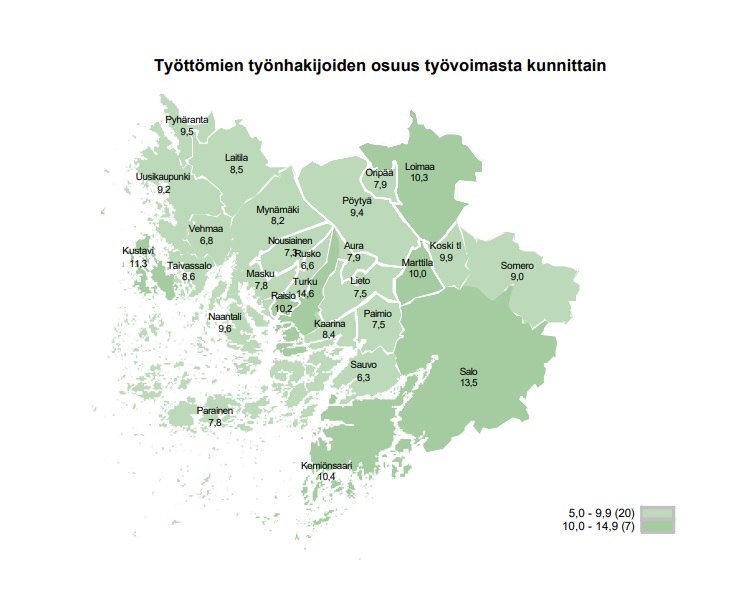 Työttömyysaste oli korkein Salon seudulla (12,9 %) sekä Turun kaupungissa (14,6 %). Pienin työttömyysaste oli Turunmaan saaristossa (8,6 %) sekä kunnista Sauvossa (6,3 %).